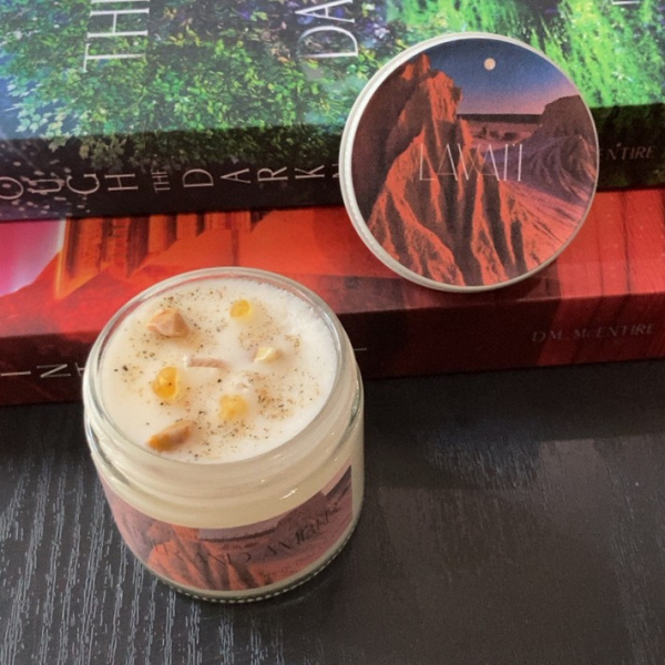 The scorching Lavai'i desert and its resilient people have been encapsulated with leather and amber scents. This four ounce vessel is topped with sand and sandstone.